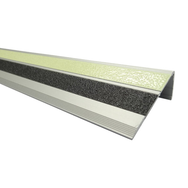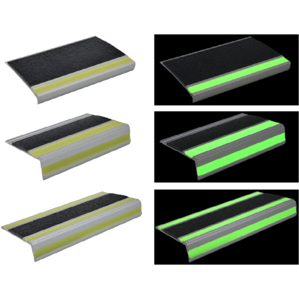 Photo luminescent stair nosing is a safety necessity when constructing or upgrading a building. Glow in the dark is part of the International Fire Code and is being implemented into State Fire Codes. Glow stair nosing not only help with visibility during a blackout, but is also slip-resistant.
